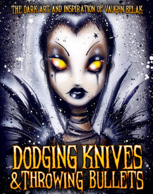 “Vaughn Belak‘s artistic creations draw you in with a luminous, large-eyed gaze, spatters of shadow and light creating an alluring blend of fae mischief and gothic gloom…Dodging Knives and Throwing Bullets, will give art fans a close look at not just Belak’s art, but also the mind of the artist.” –Ed Grabianowski, Gothic.net